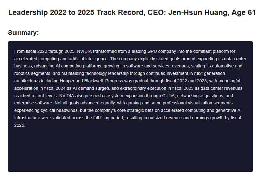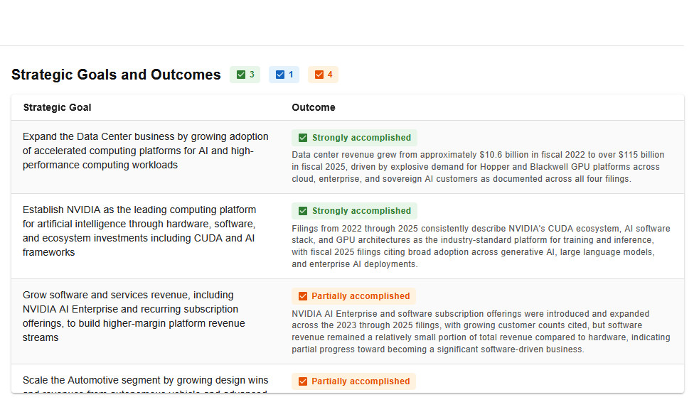 Compares the objectives set by the leadership and executive suite from 3 years ago, with the actual performance over the period with the most recent filings